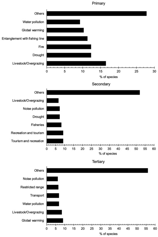 In our analysis, we categorized threats into primary, secondary, and tertiary levels for each species, considering their relative importance and severity (Figure 9). Interestingly, we found no statistical difference (ANOVA: F(2) = 13.6, p = 1.8) in the number of species in each of the threat ranks (primary, secondary, and tertiary), indicating that shorebird species are equally susceptible to threats across different levels. Among the identified threats, tertiary threats (n = 308) affected the highest number of species, whereas the lowest number of species were impacted by primary threats (n = 97).