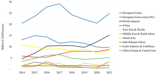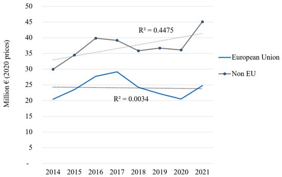 Lobal imports by region 2014–2021 in million EUR (2020 prices). Notes: (1) The European Union (EU) includes 27 EU countries plus the UK (until 2020), Switzerland, Norway, Iceland, and San Marino (The United Nations Comtrade (UN Comtrade) database, code “HS 03011900 Live ornamental fish (excluding freshwater)”. (2) Import values are deflated by the Harmonized Index of Consumer Prices (EuroStat 2023) [].