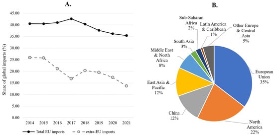 (A): Market share of European imports in the global imports value of marine ornamental fish. (B): Share (%) of import value by region in 2021. Source: Own calculations based on UN Comtrade database, “HS classification 03011900 Live ornamental fish (excluding freshwater)”.
