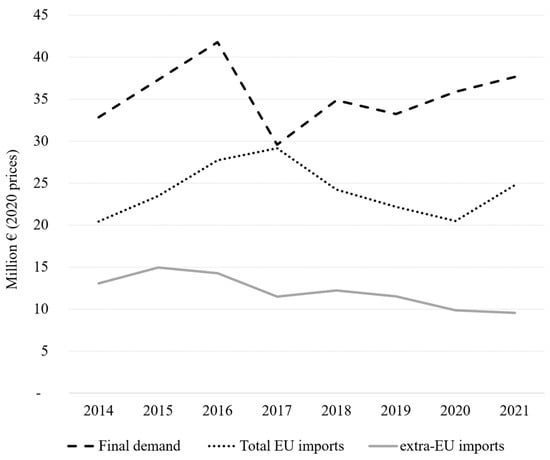European value trade (imports) and final demand in marine ornamental fish (million EUR at 2020 prices) from 2014 to 2021; authors’ calculations based on UN Comtrade database, classification “HS 03011900 Live ornamental fish (excluding freshwater)”.