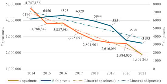 Overall shipments and number of traded specimens per year of marine ornamental fish and linear regression from 2014 to 2021 entering Europe according to data from the TRAde Control and Expert System (TRACES).