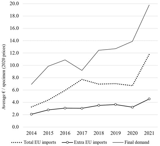 European marine ornamental imports: average prices and final demand in marine ornamental fish (value in EUR, 2020 prices) from 2014 to 2021; authors’ calculations based on the EuroStat database and TRACES data.