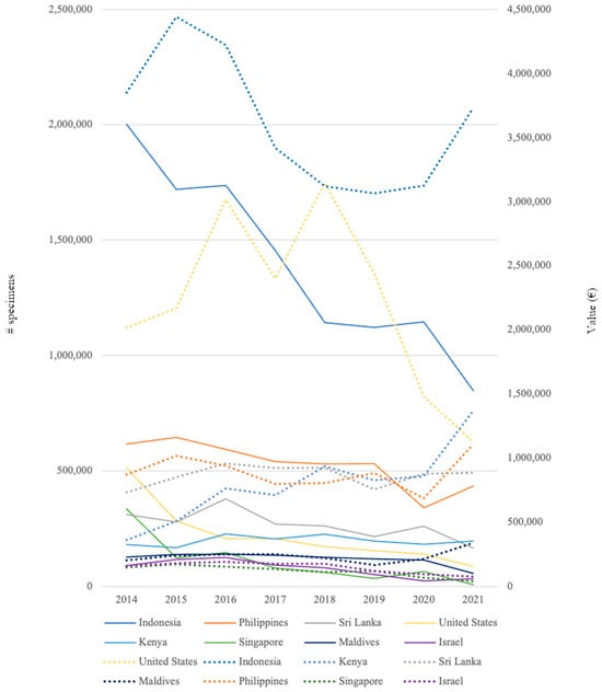 Number of specimens of marine ornamental fish traded and value per year of the top eight exporting countries from 2014 to 2021 entering Europe according to TRACES data. Straight line = specimens; dotted line = value (EUR).