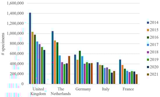Number of specimens of marine ornamental fish imported to the five top importing European countries by year from 2014 to 2021, according to TRACES data. The United Kingdom left the EU at the end of 2020.