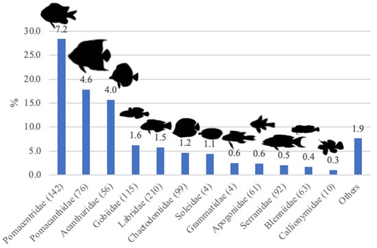 All scientific fish names were checked by using the World Register of Marine Species (WoRMS; http://www.marinespecies.org (accessed on 23 September 2023)) and FishBase (http://www.fishbase.org (accessed on 23 September 2023)), the two main global species databases of fish species that are kept up to date. Records of fish lacking their complete genus or species identification were allocated to their family, as well as all fish with complete species names, by using FishBase and WoRMS.