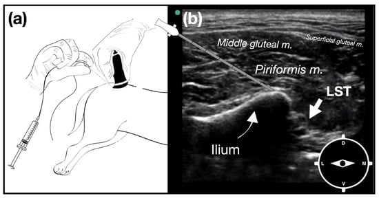 Ultrasound-guided greater ischiatic notch (GIN) plane injection. (a) The dog is positioned in lateral recumbency with the pelvic limbs in a neutral position. The transducer is positioned transversally on the middle third of an imaginary line connecting the cranial dorsal iliac spine with the medial angle of the ischiatic tuberosity, with its mark facing laterally. Ultrasound-guided GIN plane injection: the needle is introduced in-plane from the lateral aspect of the transducer. (b) Ultrasound image showing the dorsolateral aspect of the greater ischiatic notch and the neurovascular bundle containing the lumbosacral trunk (LST).