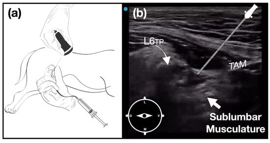 Ultrasound-guided caudal quadratus lumborum block (C-QLB). (a) The dog is positioned in lateral recumbency with the pelvic limbs in a neutral position. The transducer is positioned over the transverse process of L6 (L6TP), cranial and parallel to the crest of the ilium with its mark facing dorsal. (b) Ultrasound image showing the sublumbar musculature on the ventral aspect of the L6 transverse process. TAM: transversus adominis muscle.