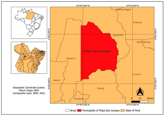 The experiment was carried out on a rural property in the municipality of Mojuí dos Campos, Pará, (Figure 1) during the wettest months (December to May). According to Martorano et al. [30], the climate in the region is hot and humid with an average temperature of 25.6 °C and air humidity ranging from 84 to 86%. Furthermore, the periods of the greatest and least intensity of rainfall in this region can be divided into quarters, with the wettest being observed between the months of February and April [31].