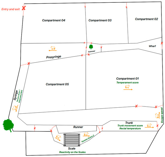 Infographic of the corral used to handle the animals and the respective places where the parameters were evaluated. X in red indicates the areas of the corral where data were collected according to the parameter.