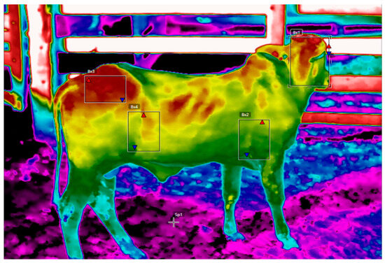 The BST was analyzed using an infrared thermometer with a scientific thermographic camera during the rainiest period (February/March/April). The evaluations were carried out at the time of collection each month between 12:00 and 15:00, specifically in the anatomical areas of the head, the armpit, the flank, and the rump, using 310 imaged points (Figure 3). Data were collected using a scientific IRT camera, with an emissivity set at 0.95, a fixed 25 mm objective, a temperature range of −40 to 150 °C, a sensitivity of 50 mk (>0.05 °C at an ambient temperature of 30 °C), and a spectral range of 0.7 to 100 μm; however, the targets photographed have a response between 0.7 and 3.0 μm, with an optical resolution of 640 × 480 pixels and a maximum emissivity index of 0.9. The temperature and humidity were controlled by positioning the observer against the sun, so as not to interfere with the camera. The thermograms were analyzed using Flir Tools software, version 6.3, with the Rainbow HC palette selected. The operator used the camera at eye level, always maintaining coherence and without the aid of a tripod, focusing perpendicular to the target, following the methodological guidelines proposed by Silva et al. [3] and Silva et al. [5].