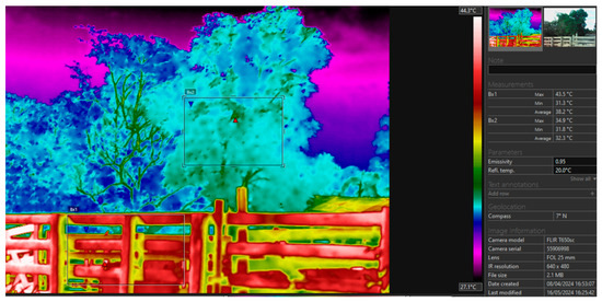 The corral environment had wooden fences with an average temperature of 38.2 °C and a maximum of 43.5 °C. The presence of trees in the corral had a temperature of 32.3 °C and a maximum of 34.9 °C, i.e., a temperature range of 5.9 °C on average and 8.6 °C at maximum when comparing the structure of the corral and the trees (Figure 4).