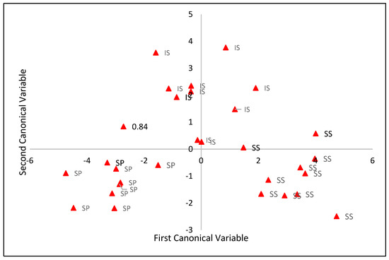 Dispersion between the canonical values of the integrated (IS), silvopastoral (SP), and traditional (SS) production systems, considering the two canonical variables.