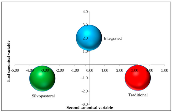 The dimensionality of the parametric space in this group was obtained by testing the null hypothesis in which the canonical correlation obtained through each eigenvalue was considered to be equal to zero. Based on the relevance of each canonical variable, the dispersions of treatments were obtained in relation to the canonical treatment means obtained using the two main canonical variables, in order to discriminate the differences between production systems.