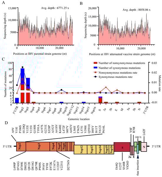 Next-generation sequencing analysis of the parental and attenuated IBV strains. (A) Sequencing depth for the IBV parental strain. (B) Sequencing depth for the attenuated IBV strain. (C) Per genomic location with number and mutation rate of nonsynonymous and synonymous mutations. The bar graph illustrates the number of mutations at each genomic location, with blue bars representing synonymous mutations and red bars representing non-synonymous mutations. Meanwhile, the line graph shows the mutation rates for genes, with blue lines indicating synonymous mutation rates and red lines indicating non-synonymous mutation rates. (D) Distribution of amino acid mutations across the parental and attenuated strains of IBV.