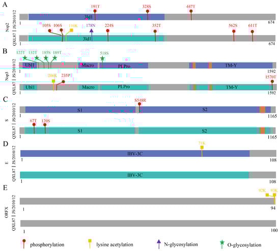 Schematic diagram of PTM mutations of Nsp2 (A), Nsp3 (B), S (C), E (D), and ORFX (E) proteins during IBV attenuation.