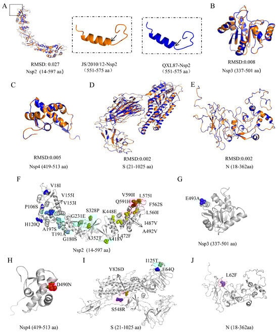 Three-dimensional structural analysis of proteins that changed between parental and attenuated strains. The monomer structural overlap of Nsp2 (A), Nsp3 (B), Nsp4 (C), S (D), and N (E) proteins between parental and attenuated strains. Cartoon model of Nsp2 (F), Nsp3 (G), Nsp4 (H), S (I), and N (J) proteins where the mutated amino acids are shown.