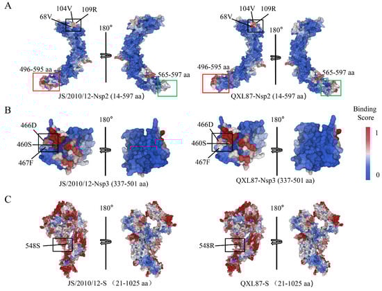Prediction and comparison results of protein binding sites in Nsp2 (A), Nsp3 (B), and S (C) proteins of parental and attenuated strains, with colors indicating binding propensity, from low (blue) to high (red).