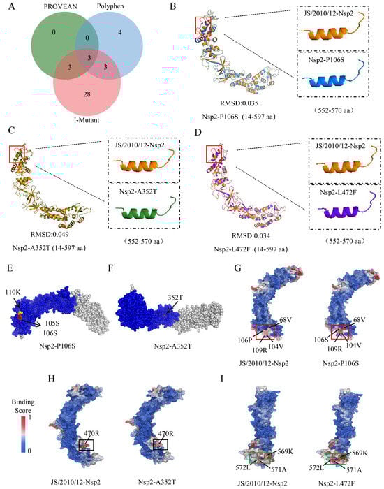 Amino acid mutations might impact DNA transcription and translation, leading to changes in protein structure and function []. The effects of amino acid mutations in the viral genome on protein function were predicted using PROVEAN and PolyPhen software. PROVEAN identified six deleterious mutation sites, while PolyPhen identified ten damaging mutation sites. I-Mutant software was used to evaluate the impact of amino acid mutations on protein stability. Out of 48 mutation sites analyzed, 37 were found to decrease protein stability (Table 1). A Venn diagram analysis pinpointed three significant functional mutation sites: P106S (Nsp2), A352T (Nsp2), and L472F (Nsp2) (Figure 5A). Three-dimensional protein structure comparison showed that all three functional mutation sites were involved in the structural changes in the Nsp2 protein, where the 565th amino acid changed from a helical to a coiled structure (Figure 5B–D). Further analysis revealed that the P106S mutation introduced new protein phosphorylation (105S and 106S) and lysine acetylation sites (110 K) (Figure 5E) and significantly enhanced the protein binding affinities at amino acid positions 68, 104, 106, and 109 (Figure 5G). The A352T mutation introduced a new phosphorylation site (352T) and reduced the protein binding affinity at amino acid 470 (Figure 5F,H). The L472F mutation enhanced the protein binding affinity at amino acids 569, 571, and 572 (Figure 5I).