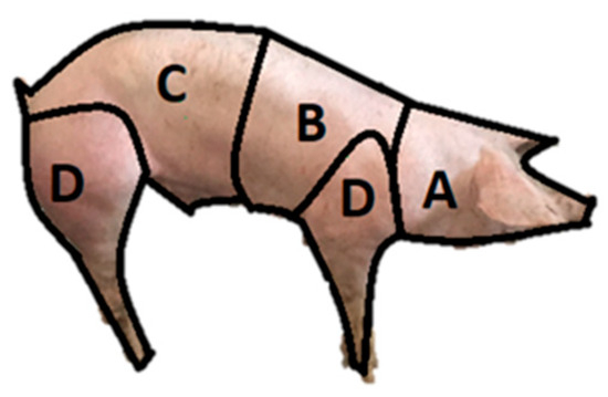 Pig model with divided areas: (A) anterior area, including the skull and cervical vertebrae; (B) thoracic area, including thoracic vertebrae, ribs, and sternum; (C) posterior area, including lumbar and coccygeal vertebrae, coxae, and sacrum; (D) limbs.