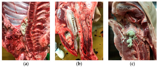 Osteomyelitis in different locations of the carcass: (a) thoracic area; (b) anterior area; (c) posterior area.