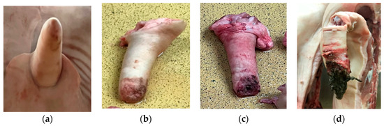 - Teixeira, D.L.; Harley, S.; Hanlon, A.; O’Connell, N.E.; More, S.J.; Manzanilla, E.G.; Boyle, L.A. Study on the association between tail lesion score, cold carcass weight, and viscera condemnations in slaughter pigs. Front. Vet. Sci. 2016, 3, 24. [Google Scholar] [CrossRef] [PubMed]