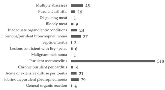 Osteomyelitis was by far the most registered cause for total condemnation of pig carcasses in our study (61.04% of TCs), followed by multiple abscesses (8.63% of TCs) and bronchopneumonia (7.10% of TCs). This is in accordance with similar studies on the subject [6,37]. The most common carcass location of osteomyelitis was in the posterior and thoracic vertebrae (199 cases), amounting to a considerable 62.57% of total CCOs. This aligns with Vieira-Pinto et al. (2020), as they considered vertebral osteomyelitis the main cause of the total condemnation of pig carcasses in Portugal [5]. One surprising result was the high number of osteomyelitis cases found in the anterior region of the pig carcass, particularly in the mandibular area. To our knowledge, no such finding has ever been reported in other similar studies. A possible connection to teeth management was analysed and discussed further. It is nevertheless evident that CCO represents a negative economic impact on the Portuguese swine industry, and further studies should be made to combat the lack of sufficient research into the topic.