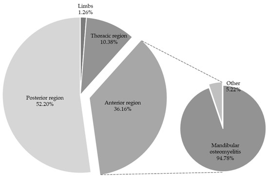 Regarding the 318 CCOs, 115 cases (36.16% of CCOs) were in the anterior region, 33 cases (10.37% of CCOs) were in the thoracic region, 166 cases (52.20% of CCOs) were in the posterior region, and 4 cases (1.25% of CCOs) were in the limbs (Figure 5). All cases of osteomyelitis in the posterior and thoracic region were in the vertebrae. Of the 115 CCOs in the anterior area, 109 cases were present in the mandibular bone, representing 34.27% of CCOs (Figure 5).