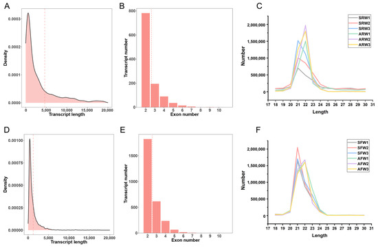 The known lncRNAs of red pandas are not annotated in the genome. After the assembly of the transcriptome, a series of strict filtering procedures were used to screen and identify 1134 novel lncRNA transcripts in the stomach tissue samples of red pandas (Figure S1A). In the stomach samples of red pandas, the number of novel lncRNAs annotated with “u” using Gffcompare was the largest (Figure S1B), the average length of novel lncRNAs was 4635 nt (Figure 1A), and the number of novel lncRNAs with two exons is the highest (Figure 1B). In addition to the known lncRNAs annotated in the reference genome, 474 novel lncRNA transcripts were identified in the stomach tissue samples of ferrets (Figure S1E). In the stomach samples of ferrets, the number of novel lncRNAs annotated with “u” using Gffcompare was also the largest (Figure S1F), the average length of all lncRNAs was 1246 nt (Figure 1D), and the number of all lncRNAs with two exons is the highest (Figure 1E).
