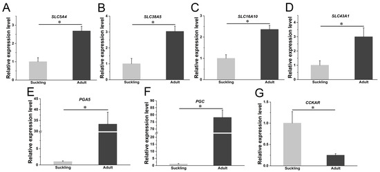 Real-time PCR of some digestion- and metabolism-related DE-mRNAs in red pandas. The relative expression levels of glucose transporter (A), amino acid transporters (B–D), proteases (E,F), cholecystokinin receptor (G)-related DE-mRNAs in stomach samples between suckling group and adult group of red pandas. The X axis represents different groups; the Y axis represents the relative mRNA expression levels; * represents significant differences in mRNA expression levels.
