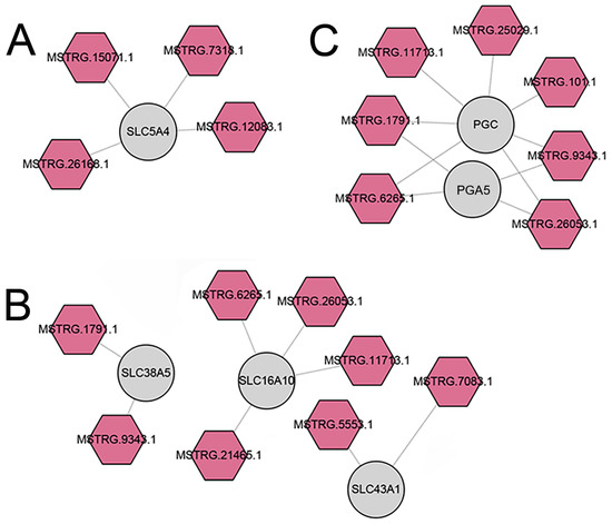 Digestion- and metabolism-related lncRNA-mRNA networks in red pandas. The interaction networks of DE-lncRNAs and DE-mRNAs associated with glucose transport (A), amino acid transport (B), and protease (C) in stomach samples between suckling and adult group of red pandas. The palevioletred hexagons represent the up-regulated DE-lncRNAs of adult group; the circles represent the target mRNAs of DE-lncRNAs.