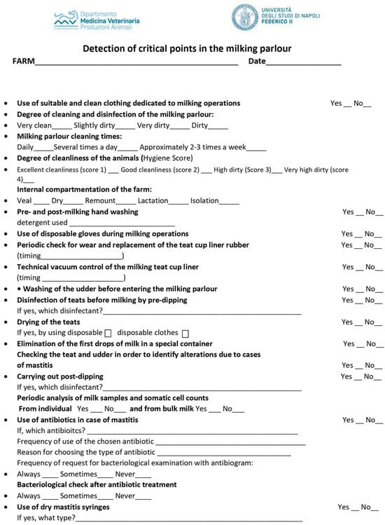 Each farm was sampled 4 times during the evening milking shift of the different seasons. Firstly, dairy farm owners were requested to complete a questionnaire at the beginning of the study period, to detect and collect information on milking management, hygiene, and animal health to evaluate any critical points of the “milking system” (Figure 1).