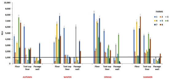 The results showed great variability during the different seasons both among the selected farms and for the sampled areas (Figure 2). In particular, the value of bioluminescence measurement obtained from passage wall samples of almost all the farms was lower or equal to 1000 RLU (chosen RLU threshold of acceptable cleaning), overall, in summer and autumn. Precisely, the passage wall samples showed in autumn (farm n. 7) and in summer (farm n. 8) RLU results higher than the established threshold, 3500 and 1500 RLU, respectively. With regards to the inner surface of the teat cup liner, farms n. 4 and 5 in autumn, farms n. 4, 6, 7 and 8 in winter, and farms n. 4 and 7 in spring showed values lower than 1000 RLU; whereas in summer the recorded values were higher than 1000 RLU in all the farms. Particularly, the farm n. 1 showed very high values, around 6000 RLU, in autumn, winter, and spring, with a slight decrease in summer, around 4500 RLU (Figure 2). In winter, three farms (n. 2, 3 and 5) displayed values never higher than 1500 RLU. For farms n. 6 and 8, a relevant increase was recorded (>4000 RLU) in the summer. The highest RLU values were found on the floor of all the farms in spring, with 8000 RLU in farm n. 1, probably due to the fact that the sampling was carried out on rainy days; however, also in summer for farms n. 1, 4, 7, and 8, RLUs > 6000 were measured, likely related to buffaloes’ habit of wallowing in mudholes to cool off. However, the farm identified as n. 5 (Figure 2) turned out to be the cleanest one, exhibiting low RLU (<1000) values in autumn, winter, and spring. All data derived from RLU measurements were analysed using the pairwise comparison procedure between the different seasons, and no significant results with p < 0.05 were obtained.