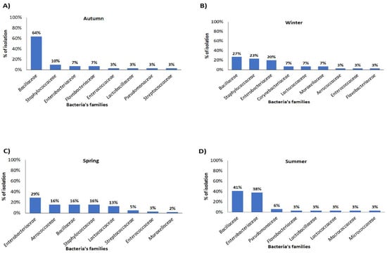 Among positive samples, a higher prevalence of Bacillaceae was found during autumn and summer with a rate of 64% and 41%, respectively (Figure 3C,D), while during colder months the isolation frequency was below 30% (Figure 3A,B). No Staphylococcaceae was isolated in the summer sampling, while isolation values of 10%, 16%, and 23% were recorded in autumn, spring, and winter, respectively. Conversely, an increased frequency of isolation was observed for Enterobacteriaceae during the warmer months, with levels of 29% in spring and 38% in summer (Figure 3C,D).