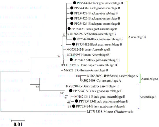 A phylogenetic tree was conducted to explore the relevance of detected assemblages and sub-assemblages in this study. As shown in Figure 2, the tree revealed that the assemblage E detected in this study consistently clustered with the reported assemblage E and had a close relationship with reported assemblage E in cattle and goats. It is noteworthy that the tree also demonstrated that the novel assemblage B was closely related to the reported assemblage B, which was detected in humans.