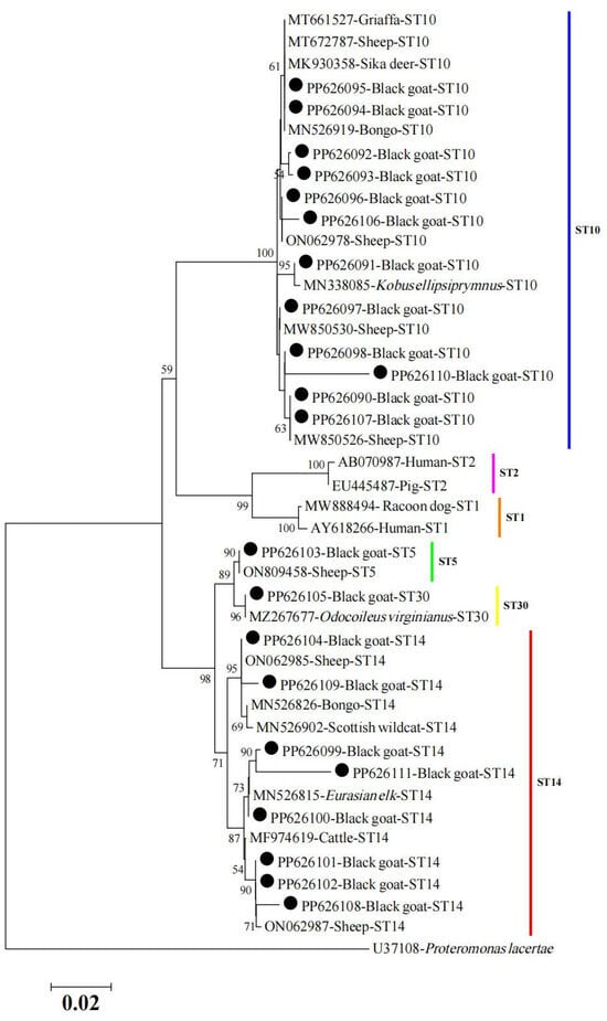 In this study, four subtypes (ST5, ST10, ST14, and ST30) of Blastocystis spp. were identified in black goats in Shanxi Province, with the predominant subtype being ST10, consistent with previous studies reported in Asia [36]. ST10 and ST14 were the most prevalent subtypes of Blastocystis spp. in sheep and goats in Asia, and have been reported in some provinces of China, such as Guangdong Province [29]. ST10 and ST14 were detected in children in Senegal, suggesting their zoonotic potential and threatening public health [33,65]. Importantly, the present study first reported the occurrence of Blastocystis ST30 in black goats in China. A previous report detected ST30 in sheep in China [25]; however, the transmission dynamics and pathogenicity of ST30 are still unknown. ST5, a valid zoonotic subtype of Blastocystis spp., has been detected in humans, livestock, and wild animals [20], and was detected in the present study in only two fecal samples.
