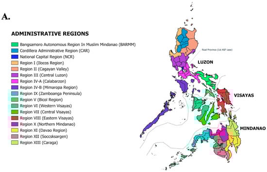 ASF has spread extensively in the swine industry, affecting both commercial and backyard pigs as well as wild pigs since its introduction into the country in 2019. The control and prevention of ASF greatly depend on the collaborative efforts and cooperation of all stakeholders, veterinarians, policy makers, and other institutions starting from timely reporting of ASF cases to early diagnosis and strict implementation of prevention and control measures. The Philippine government, headed by the Department of Agriculture and Bureau of Animal Industry, has been vigilant in implementing various ASF control and prevention strategies (Figure 4). The implementation of Administrative Circular No. 12, Series of 2019 (National Zoning and Movement Plan for the Prevention and Control of African Swine Fever) was among the initial government responses to the ASF outbreak, designating different zones based on ASF risk levels [59]. The zoning and compartmentalization program of three different regions in the Philippines is based on disease status, protecting unaffected areas while controlling disease in infected areas. Infected zones or areas with confirmed ASF cases are indicated in red color; pink indicates the buffer zones, which are areas adjacent to infected zones and include provinces that still have infected areas but no new ASF cases; yellow indicates areas under surveillance zones, which are high-risk areas due to the volume of pigs, pork, and other animal products for trade and a large number of swine. Light green areas are protected zones, which have no cases of ASF and are considered low-risk areas; green areas are ASF-free areas (Figure 5A).