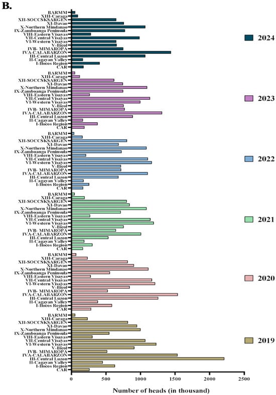 Distribution of swine inventory per region from 2019 to 2022. (A) Map of the Philippines with its administrative regions. Map was created in QGIS version 3.30. (B) Values presented represent the total number of swine heads including small hold, semi-commercial, and commercial farms from each region at the time of report dates indicated. All data and values presented were retrieved from the Special Release of Swine Situation Report by the Philippines Statistics Authority (PSA) from their reports in 2019 (1 July 2019), 2020 (20 June 2020), 2021 (30 September 2021), 2022, 2023 and first quarter of 2024.