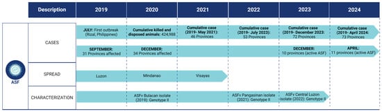 Timeline of ASF outbreaks and epidemiology in the Philippines. ASF, African swine fever; ASFv, ASF virus. The figure was created in BioRender.com (accessed on 15 March 2024).