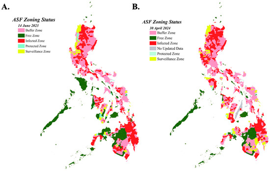 ASF zoning map of cases in the Philippines as of 14 June 2023 (A) and 30 April 2024 (B). Maps show the zoning and compartmentalization status of the different municipalities based on ASF disease risk. Data presented were retrieved from the update on zoning status of regions in relation to the implementation of the national zoning and movement plan for African Swine Fever (ASF) by the Bureau of Animal Industry, Philippines with permission. Map was created in QGIS version 3.30.