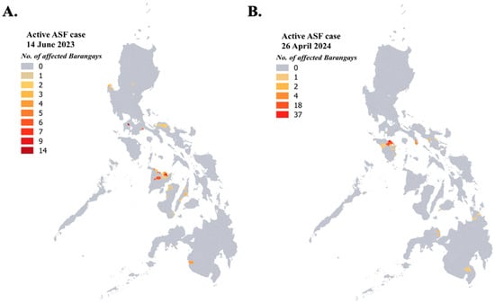Geographical distribution of ASF active cases in the Philippines as of 14 June 2023 (A) and as of 26 April 2024 (B). Maps show reported location of active cases of ASF from different municipalities. Colors represent the number of affected barangays (smallest political unit) with ASF active cases for each municipality. Active cases refer to the current or ongoing confirmed presence of ASFV in the area. Data presented were retrieved from the ASF updates by the Bureau of Animal Industry, Philippines with permission. Map was created in QGIS version 3.30.