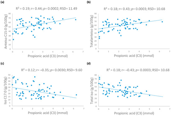 Linear adjustments between (a) propionic acid (C3) and anteiso C15:0; (b) propionic acid (C3) and total anteiso; (c) propionic acid (C3) and iso C17:0; (d) propionic acid (C3) and total iso in faecal samples.