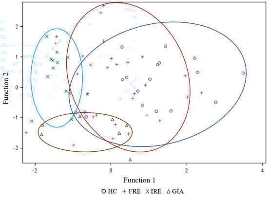 Additionally, a discriminant analysis was carried out in order to evaluate the discriminant potential of the studied variables (Figure 2). The most determinant variables that contributed to functions 1 and 2 in the canonical discriminant functions were C16:1n-7/C16:0, C18:1n-9/C18:0, ∑n-3, and C2. Taking into consideration this multivariable analysis, the IRE and GIA groups were the ones that differed the most from the HC and FRE groups, while the FRE and HC groups showed some overlap between them.