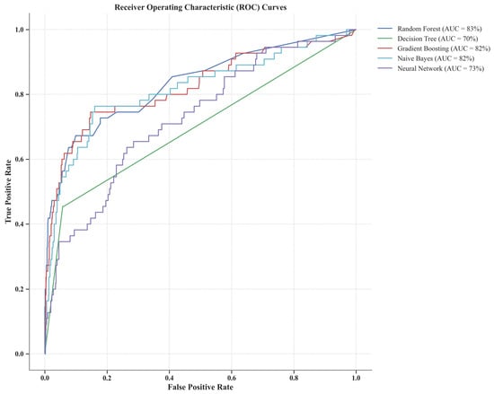 The receiver operating characteristics (ROCs) curve (Figure 9) showed that random forest and gradient boosting were the best at predicting calving day, with AUC values of 85% and 83%, respectively. Naïve Bayes and neural networks (multilayer perceptron) also demonstrated good predictive power, with AUC values of 82% and 81%, respectively. The decision tree model exhibited the lowest predictive capability, with an AUC value of 71%. Interestingly, models with higher F2 scores generally exhibited higher AUCs, suggesting their effectiveness in both identifying true calving events and minimizing false-positive events.