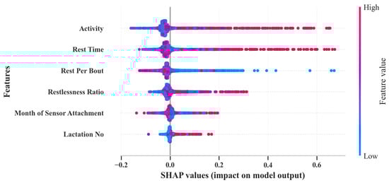 To predict the calving day (day 0), six features were extracted from postural behavioral data: activity, rest time, rest per bout, restlessness ratio, month of sensor attachment (1–12, record month), and lactation No. (1, 2, and ≥3). A Shapley Additive Explanations (SHAP) model was used to identify the most important features for predicting calving events.