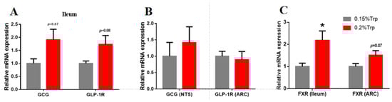 To further explore the cause of the lower feed intake resulting from the addition of dietary tryptophan, we detected the expression levels of GLP-1, GLP-1R, and FXR in both the ileum and brain (Figure 1). The data showed that the mRNA expression of GCG and GLP-1R in the ileum tended to increase, while no significant changes were observed in the mRNA expression of these genes in the NTS or the ARC of the brain. In addition, the mRNA expression of FXR, a bile acid receptor, was significantly upregulated in the ileum but tended to increase in the ARC.