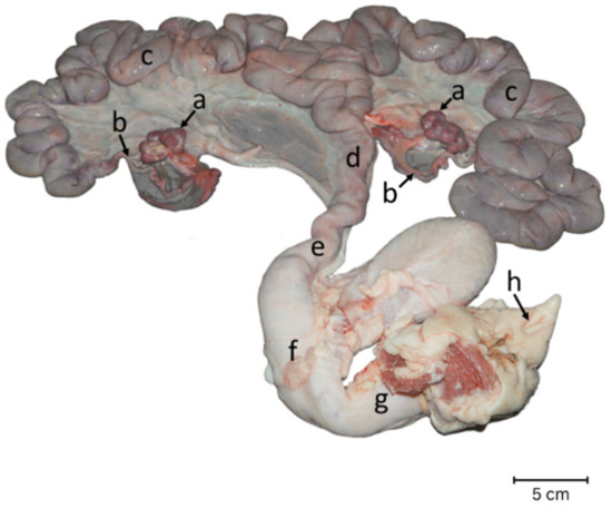 Gross morphology of the reproductive organs of Landrace × Yorkshire sows. a = ovary, b = oviduct, c = uterine horn, d = uterine body, e = cervix, f = vagina, g = vestibule, and h = vulva.