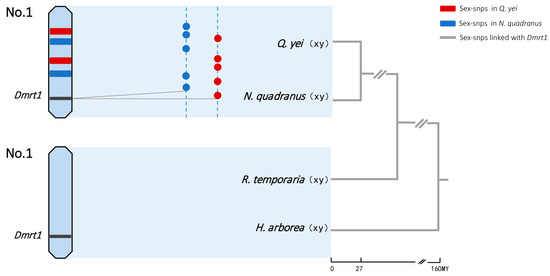 Sex chromosomes and sex-linked genes in four frogs. Sex-determination system and sex-chromosome identities were from GBS data in N. quadranus and Q. yei (the majority of sex-linked markers mapped to chromosome 1 of Q. spinosa and N. parkeri: see detail in Figure S2, Supplementary Tables S4 and S6) and from the literature in R. temporaria and H. arborea [36,47]. Chromosome 1 harbors the candidate gene Dmrt1 for sex determination in four frogs. The dotted lines represent the sex chromosome for each species, and colored dots show sex-linked SNPs in N. quadranus (blue) and Q. yei (red). Sex-linked SNPs are randomly located, and there was no shared XY site found. The grey solid lines show that several sex-linked SNPs were mapped to the Dmrt1 gene. Tree topology and approximate divergence times (My) were adapted using a combination of data from Che et al. (2010), Yuan et al. (2019) [37,48] and http://timetree.org (accessed on 4 February 2024).