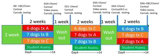 Blood was drawn from each dog prior to and after the completion of each phase of treatment, the day before the treatment started and then again on day 14 of treatment. Two cc of blood was collected in a 4 mL EDTA tube (Beckton Dickenson, Franklin Lakes, NY, USA) while 4 cc was collected in a red top tube that was allowed to clot for 20–40 min before being spun at 3600 G for 10 min to collect serum with 1 cc allocated to clinical chemistry for serum biochemical and cortisol assessment. A 1 mL aliquot of serum was also frozen at −80 °C for eventual cannabinoid analysis. CBCs were performed at week 0 and week 9 of the study to assess any hemogram changes from initiation to study end (IDEXX Laboratories, Memphis, TN, USA). CBC parameters assessed were red blood cell count, hemoglobin, hematocrit, white blood cell count, neutrophils, lymphocytes, eosinophils, basophils and platelets. Serum biochemistry and cortisol assessment was performed prior to and at the completion of each phase of the experiment (IDEXX Laboratories, Memphis, TN, USA). Parameters assessed through serum chemistry included glucose, symmetric dimethyl arginine, serum urea nitrogen (SUN), creatinine, sodium, potassium, chloride, magnesium, calcium, phosphorus, total protein, globulin, albumin, alkaline phosphatase (ALP), alanine aminotransferase (ALT), aspartate aminotransferase (AST), bilirubin, cholesterol and cortisol concentrations.