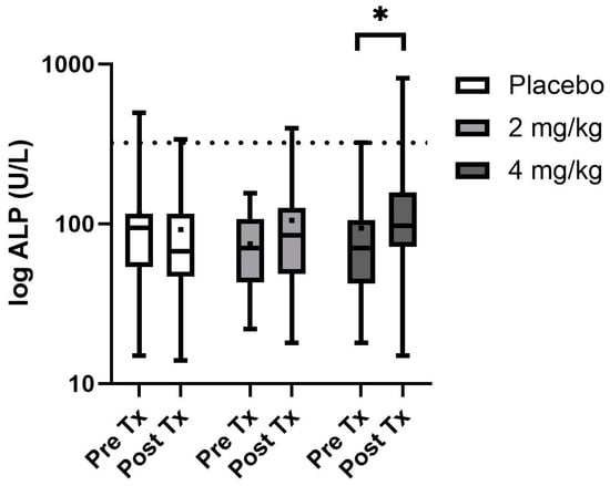 Serum ALP box and whisker plot with boxes showing the 25th and 75th median quartiles and whiskers indicating the minimum and maximum concentrations (dot within the box is mean) before treatment (day 0) and post-treatment (day 14) for each phase. Dotted line depicts the upper reference range. * Depicts a significant difference between the groups pre- and post-treatment.