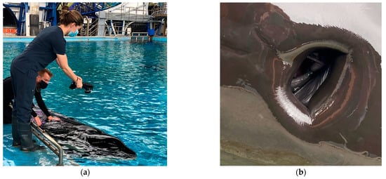 (a) A veterinarian performing an infrared blowhole temperature reading in a killer whale resting at the surface of the water. (b) A digital photograph of the open blowhole of a killer whale, for reference.
